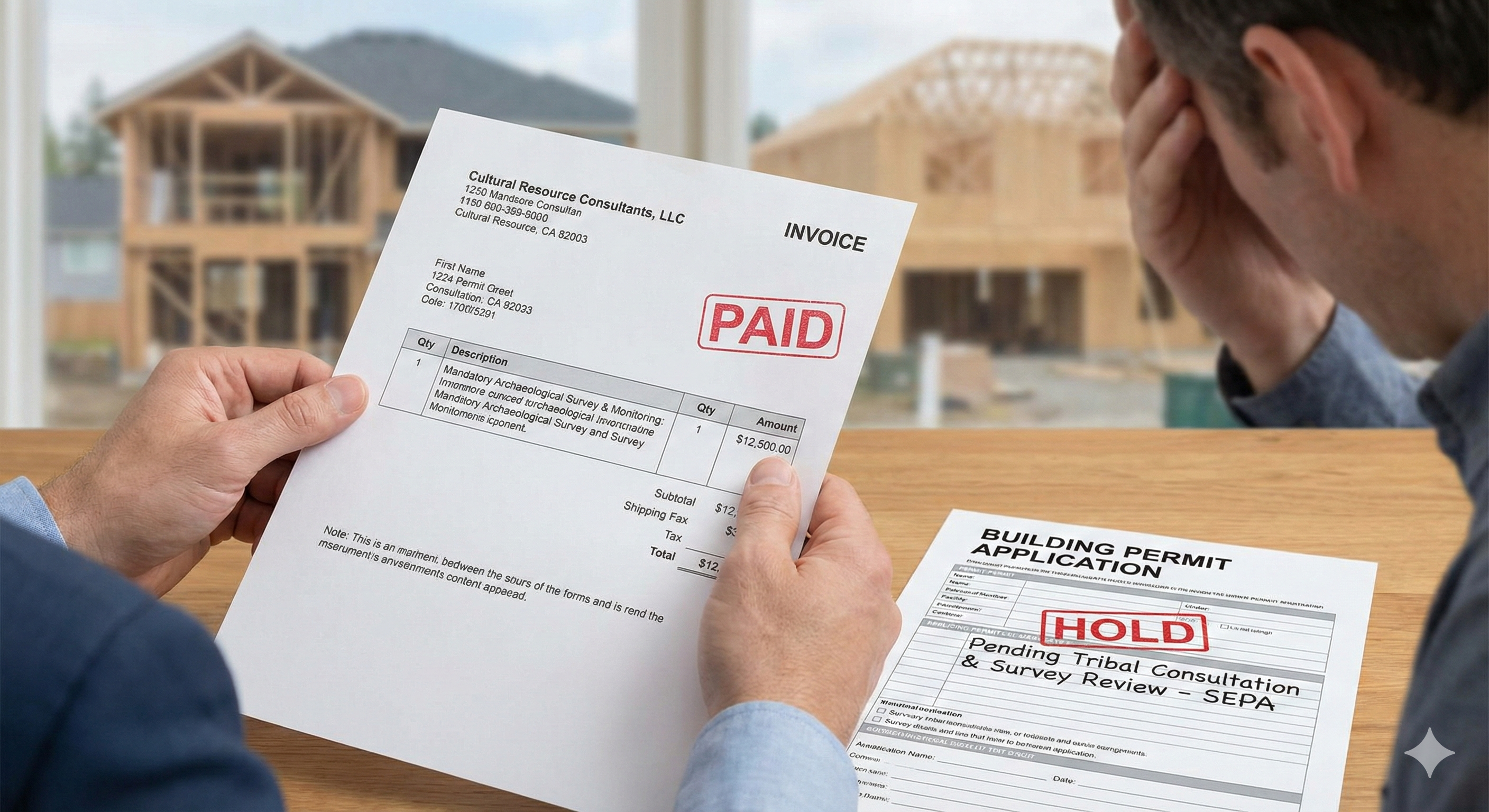 This is where the process begins to feel less like preservation and more like a tollbooth. These surveys are not free state services. The financial burden falls entirely on the property owner. You are effectively guilty until you pay to prove you are innocent. A typical cultural resource survey for a single-family lot can easily run between $3,000 and $10,000, while larger commercial projects face bills climbing into the tens of thousands. This fee goes to private cultural resource management firms or sometimes directly to tribal consultants. The tribes are thus highly incentivized to force these archaeological surveys in every possible case and then give property owners a “preferred” list of their consultants to be paid.